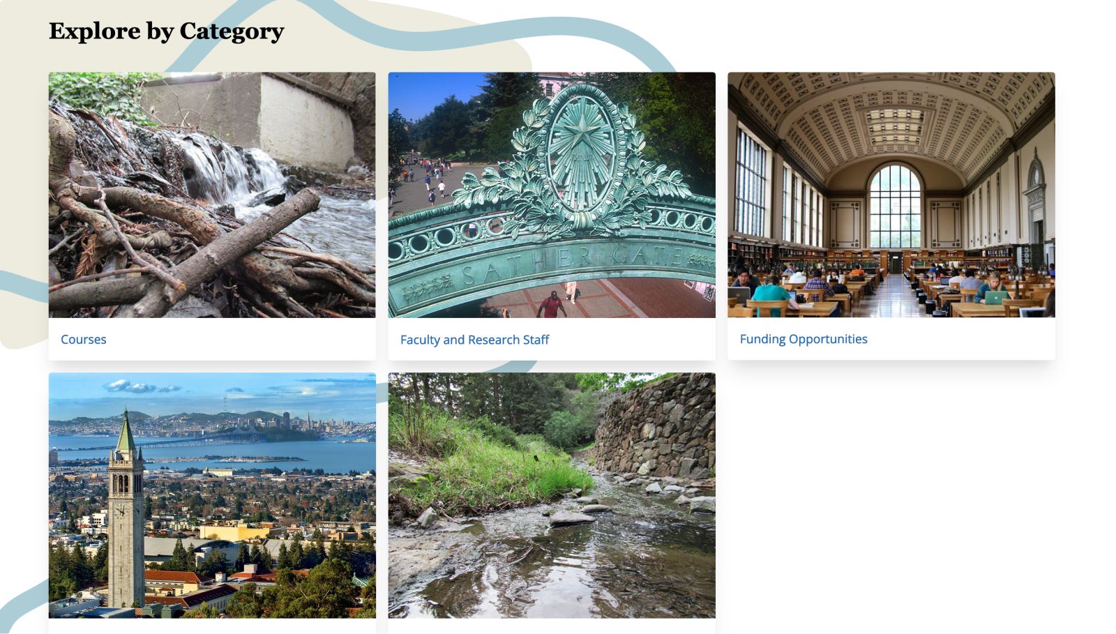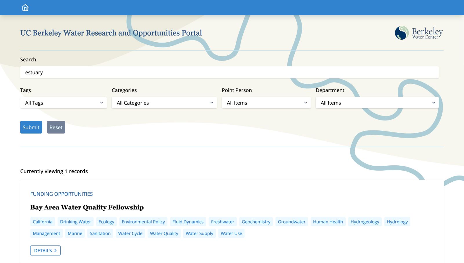 The Berkeley Water Center at UC Berkeley hired me to design and build a portal that would allow students to find courses, student groups, grants, and other resources throughout all of the UC Berkeley community that are focused on water. Each semester, students working with the BWC gather system-wide data that is then imported into the Wordpress via a CSV import. The results are easily searched and filtered on the frontend, allowing for both easy browsing or focused discovery of opportunities.